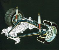 Die Aufhängungen sind mit der Karosserie durch Uniball-Kugelgelenke verbunden (die verursachen auch die Knarzgeräusche an der Hinterachse, das ist der Preis für ein hervorragendes Fahrwerk). Die Uniball-Kugelgelenke tragen dazu bei, dass eine hohe Lenkexaktheit und ein außergewöhnlich stabiler Geradeauslauf gegeben ist, und bietet somit die Möglichkeit, eine sehr hohe Seitenbeschleunigung (>1g) zu erreichen.